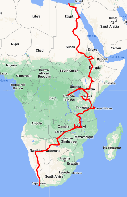South Africa, Botswana, Zambia, Malawi, Tanzania, Kenya, Uganda, Ethiopia, Sudan, Egypt |