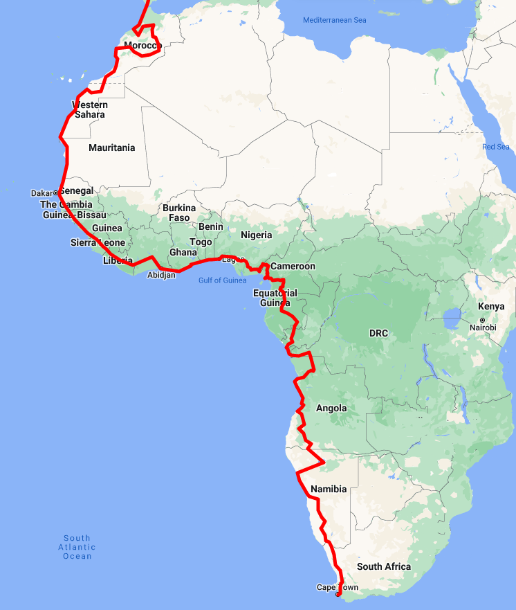 Morocco, Mauritania, Senegal, Mali, Ivory Coast, Burkina Faso, Ghana, Togo, Benin, Nigeria, Cameroon, Gabon, Congo, DRC, Angola, Namibia, South Africa. |